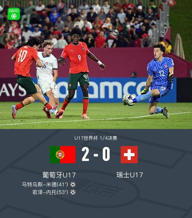 北京时间11月21日,U17世界杯四分之一决赛,葡萄牙U17对阵瑞士U17。葡萄牙U17球员马特乌斯·米德进球,何塞·内托进球。最终比分是葡萄牙U17 2-0 瑞士U17。关键比赛第41分钟,阿尼西奥助攻,马特乌斯·米德破门,葡萄牙1-0战胜瑞士。葡萄牙2-0瑞士 第53分钟,若泽·内托射门击中门将,扩大比分。两支球队的球员都参加了比赛。比赛马上就要开始了。第9分钟,班加基犯规,裁判向其出示黄牌。第18分钟,伊森·布鲁切禁区右侧射门。库尼亚将球挡出。第33分钟,马布瓦从背后踢倒了多。阿特,主裁判给了他一张黄牌。第41分钟,阿尼西奥助攻,马特乌斯·米德推射破门,葡萄牙1-0瑞士。葡萄牙2-0瑞士第53分钟扩大比分当何塞·内托射门击中守门员时。第70分钟,阿尼西奥直传后,托马斯·苏亚雷斯射门,但皮球被门将挡出。第87分钟,托马斯·苏亚雷斯外围射门,门将飞身将球扑出。球队阵容技术统计