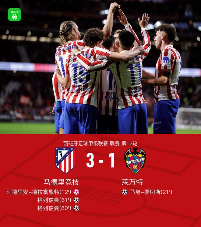 西班牙足球甲级联赛第12轮比赛于北京时间11月9日开始。马德里竞技队主场迎战莱万特队。上半场,德拉富恩特意外自摆乌龙,奥拉加斯蒂主罚角球,被马努桑切斯扑出。下半场,略伦特传球,格列兹曼插上立即破门。在阻止了阿尔瓦雷斯的射门后,格列兹曼再次射门,完成了两球的进球。最终,马竞3-1击败莱万特。关键时刻:第12分钟,德拉富恩特门前意外打进乌龙球。马德里竞技1-0莱万特。第21分钟,奥拉加斯蒂接到角球。马努·桑切斯破门。 1-1 马德里竞技队。第61分钟,略伦特传球。格列兹曼一进场就进球了。马德里竞技2-1莱万特 第80分钟,阿尔瓦雷斯射门被挡,格列兹曼随后梅开二度,马德里竞技3-1莱万特。两队球员均登场在激动人心的时刻参加比赛。比赛马上就要开始了。第24分钟朱利亚诺·西蒙尼头球破门,第28分钟马修·瑞安将球扑出。朱利亚诺·西蒙尼在禁区内倒地,但裁判没有做出任何表示。第67分钟,朱利亚诺·西蒙尼禁区内射门,皮球飞出。第72分钟尼古拉斯·冈萨雷斯上场,朱利亚诺·西蒙尼替补上场。第77分钟,科亚利普头球破门,但球被奥布拉挡出。第85分钟,柯扑救错失良机。埃尔格萨瓦尔的近距离铲射飞了出去。第89分钟,阿尔瓦雷斯任意球破门。球被马修·瑞安没收。卡洛斯·阿尔瓦雷斯在第90分钟加第3分钟进球,但他的队友越位在先,进球被判无效。球队阵容技术统计