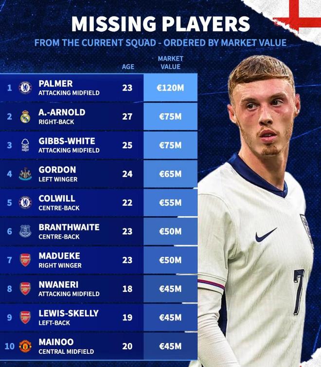 北京时间11月17日,在英格兰队七战全胜、打进22球且不失一球、晋级2026年在美国、加拿大和墨西哥举行的世界杯后,德胡安列出了未入选英格兰队的前10名球员。帕尔默以 1.2 亿欧元的身价位居第一,亚历山大-阿诺德和吉布斯·怀特以 7500 万欧元并列第二。德胡安列出了未入选英格兰国家队的前10名球员:1.帕尔默(切尔西),1.2亿欧元2.亚历山大-阿诺德(皇家马德里),7500万欧元3.吉布斯怀特(诺丁汉森林),7500万欧元4.安东尼戈登(纽卡斯尔联),6500万欧元5.科尔韦尔(切尔西)5500万欧元6.布兰斯维特(埃弗顿) 5000 万欧元 7. 马杜克 (阿森纳) 5000 万欧元 8. 恩瓦内里 (阿森纳) 4500 万欧元 9. 路易斯·斯凯利 (阿森纳) 4500 万欧元 10. 菜单 (曼联) 4500 万欧元 [在 MiG 上独家观看英超联赛]