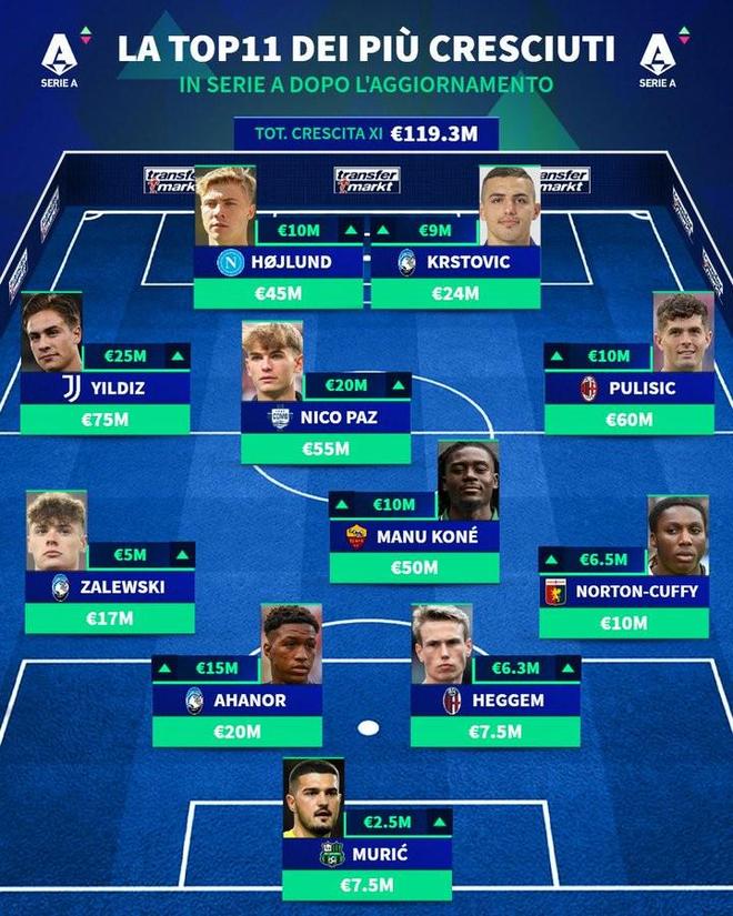 北京时间10月9日、セryエA选手の数値を更新した后、德周氏は今回最も数値が増加した11人のラインナップもrisutoppuした。 Huylen、Kenan Yildiz、Niko Paz、Pulisic、Quadio Khorne 和 Zalewski 入选。 ディフェンダー ノートン・kafu(ジェノia) 1,000万ユーロ (+650万ユーロ)、ヘゲム2000万欧元(+1500万) Eurosddofiruda·purishchi(ACミran))6,000万ユーロ(+1,000万ユーロ) 、kuadィオ・コーン(ローマ)5,000万ユーロ(+1,000万ユーロ)、niko・パsu(コモ)5,500万ユーロ(+2,000万ユーロ)、ケナン・ユルディsu(ユベntosu)75 100人(+2,500人)の见通しnicikora・kurusutoヴィッチ(タランタ)2,400万ユーロ(+900万ユーロ)、ホイren(ナポri)4,500万ユーロ(+1,000万ユーロ)